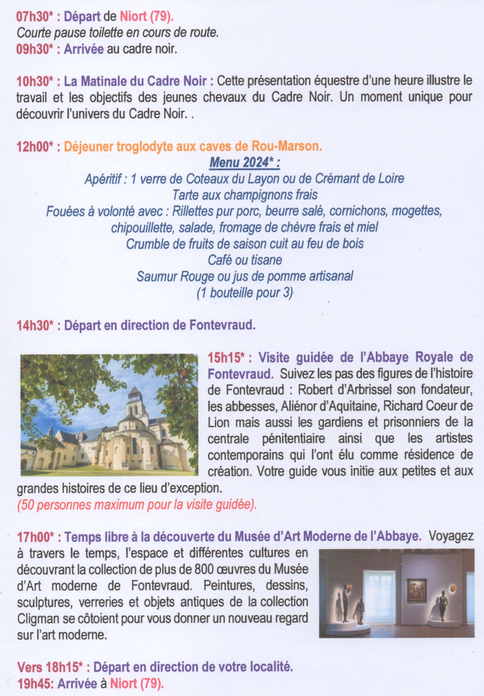 Cette sortie vous permettra de participer le matin à la présentation équestre d’une durée d’une heure environ des jeunes chevaux du Cadre Noir de Saumur. L’après-midi, vous bénéficierez d’une visite guidée de l’Abbaye Royale de Fontevraud qui, au travers des grandes figures de l’histoire de Fontevraud, vous commentera la grande histoire du lieu.